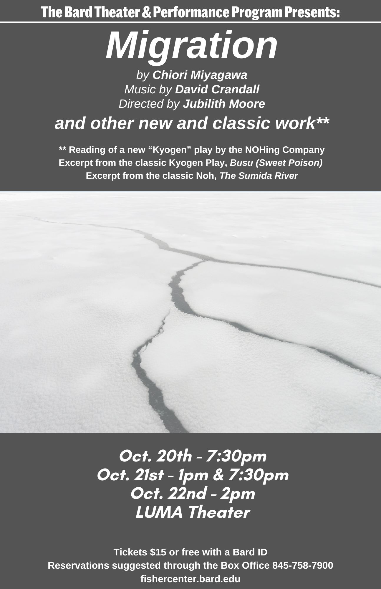 by Chiori MiyagawaFisher Center, LUMA Theater 7:30 pm – 8:30 pm EDT/GMT-4 Migration by Chiori Miyagawa Music by David Crandall Directed by Jubilith MooreAnd other new and classic works: • a reading of a new “kyōgen” by the NOHing Company • an excerpt from the classic kyōgen, Busu (Sweet Poison) • an excerpt from the classic noh, The Sumida RiverPlease join us for a post-show discussion with the director and playwright, Chiori Miyagawa, after the Friday, October 20th evening performance. |