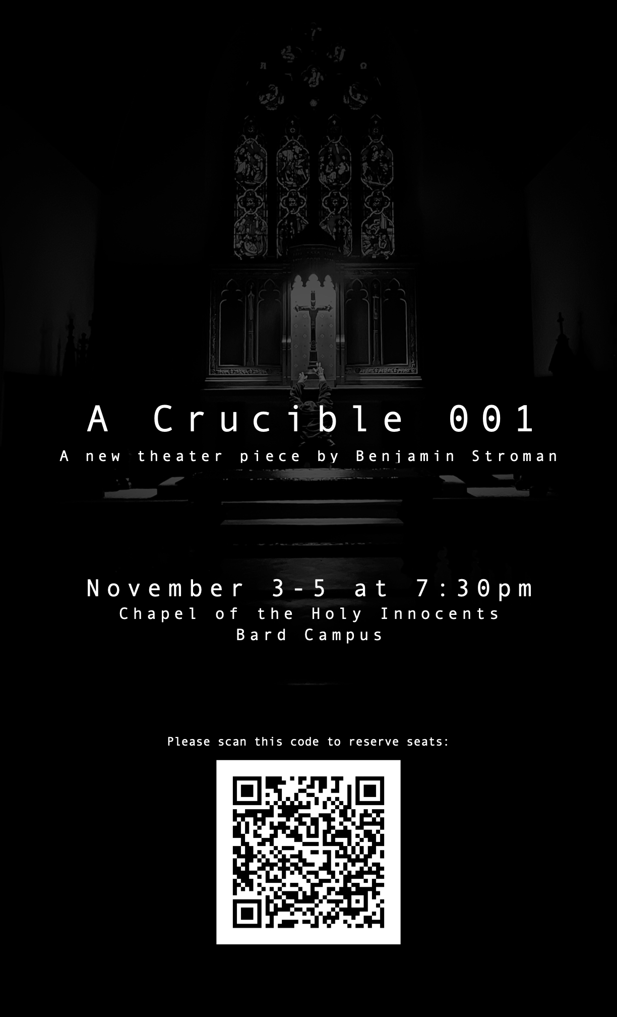 A theatrical production at the Chapel on Bard CampusChapel of the Holy Innocents 7:30 pm – 8:30 pm EDT/GMT-4 You are invited to come see this bold, sensual, and provocative new theater piece inspired by Arthur Miller's “The Crucible.” Featuring professional NYC actors and Bard students, this piece examines Miller's play through a Nietzchean lens and is strongly influenced by Euripides’s “The Bacchae.” The theatrical language is inspired by contemporary European theater revolutionaries such as Antonin Artaud, Romeo Castellucci, Pina Bausch, and Dimitris Papaioannou. Reserve your free seats at the link provided! |