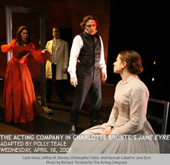 "Jane Eyre, to me, is a story of containment and release, as Jane struggles from the imprisonment of her childhood toward an almost unthinkable goal of mature freedom," says director McCallum. "I think this is what led Polly Teale to twin Jane and Bertha [Mr. Rochester's mad wife] in her adaptation. In effect, Jane is two people. One is composed, quiet, appropriate, conventional, frozen; the other is wild, violent, rebellious, engulfed in flame. Jane is always fighting to control this devouring force within her, because she's afraid if she unleashes it, it may destroy her." Polly Teale's adaptation of Jane Eyre was originally performed in 1997 by Shared Experience Theatre Company at the Wolsey Theatre in Ipswich, England.